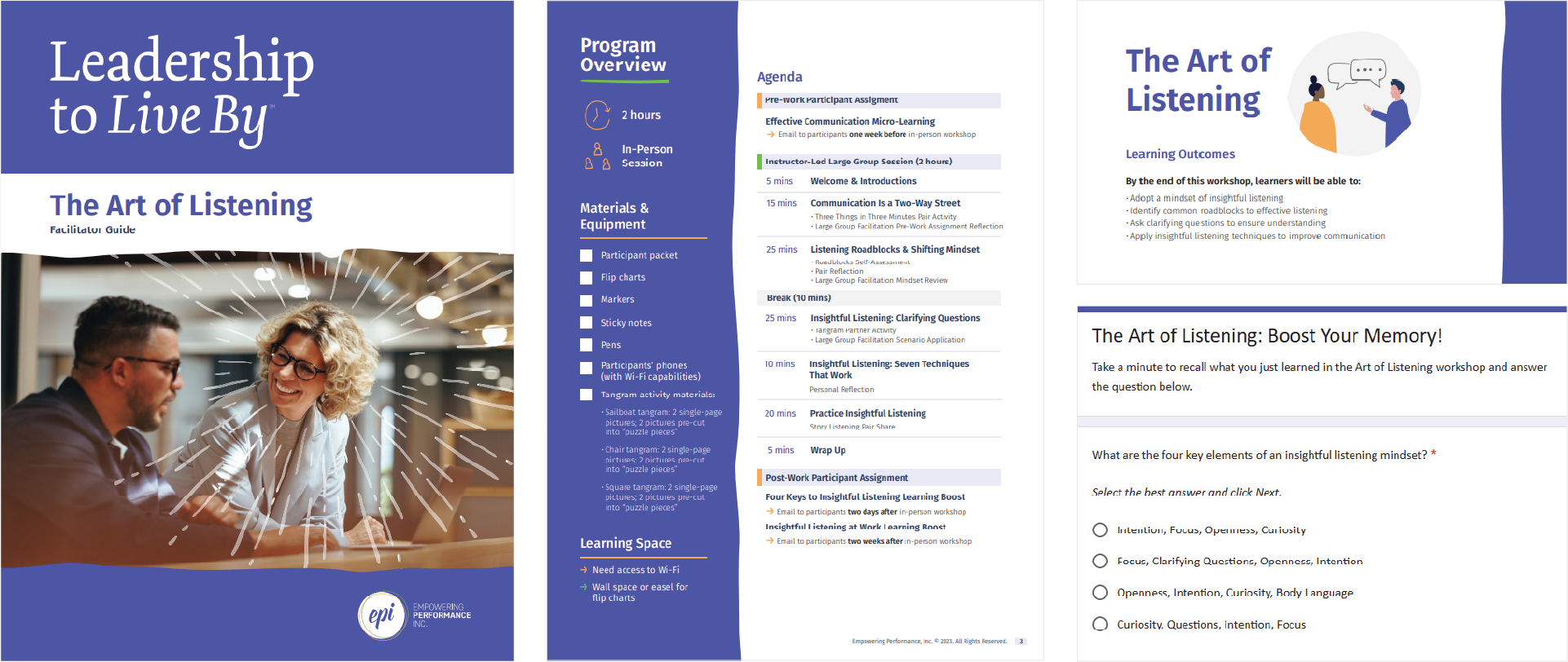 I led the rebranding of Empowering Performance Inc.’s leadership curriculum. Learning assets included: facilitator guides for instructor-led learning experiences, pre- and post-session activities, and learning journals for cohort sessions.